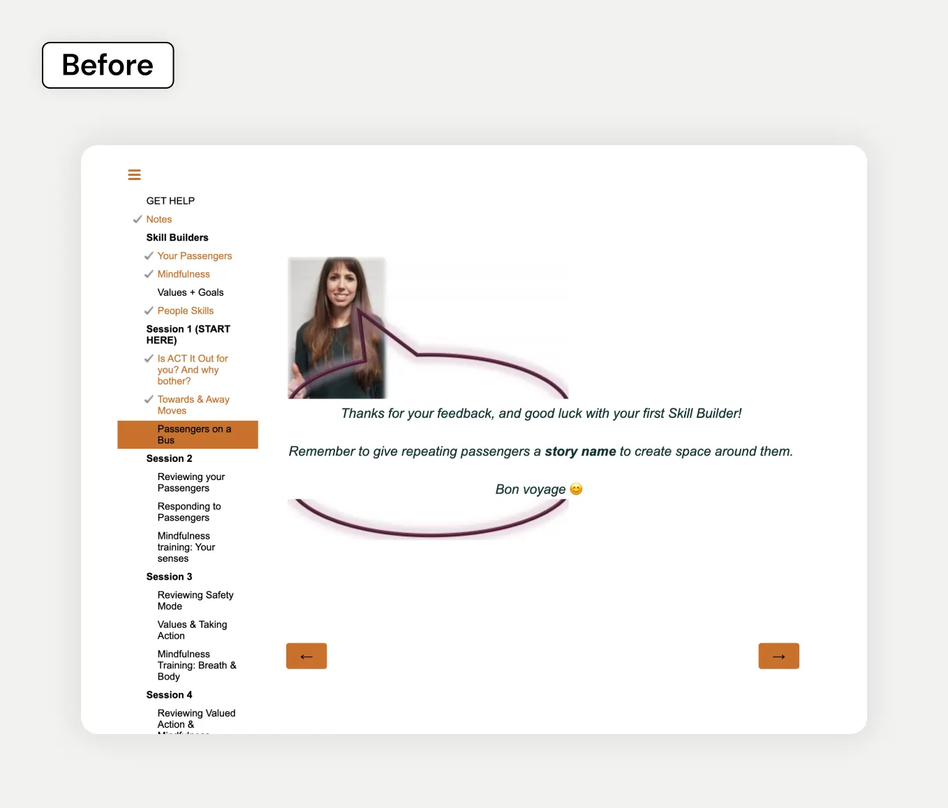 The app experience requires lengthy user engagement, each session has a very stripped back navigation with a progress bar running along the top. We kept this simple to avoid clashing with the rich user content, users would be prompted at the end of each session to leave feedback which would be collected through the app.