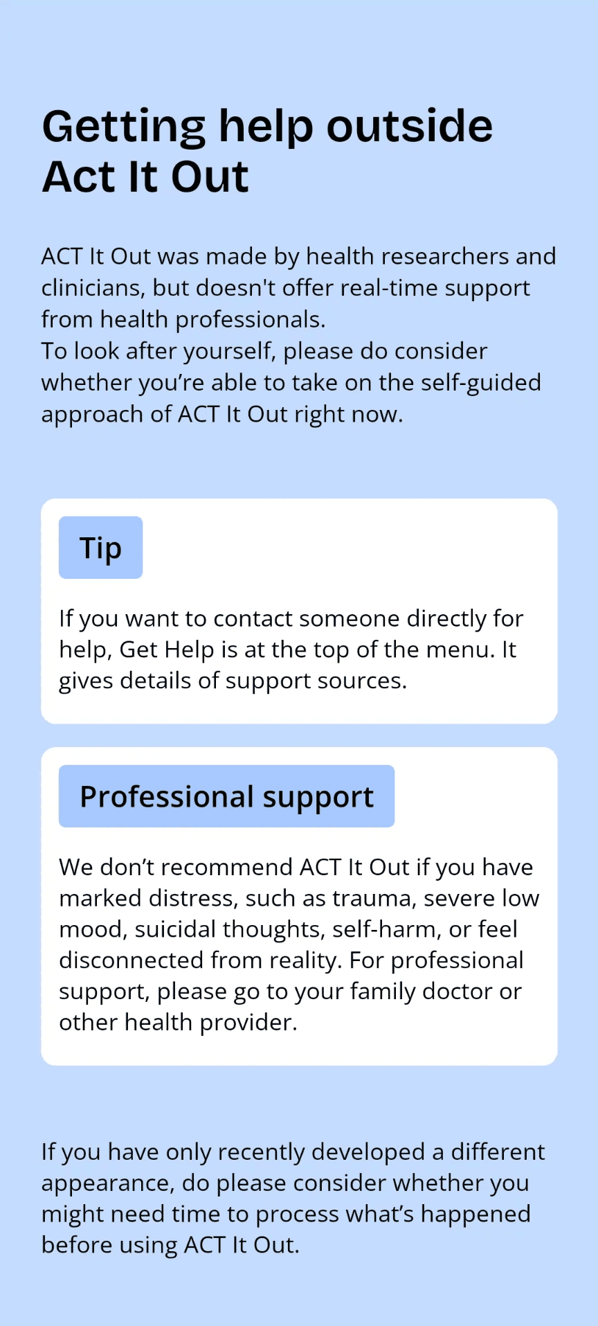 ACT It Out is a self-guided mobile app developed by the University of the West of England to support people who experience challenges related to their appearance.