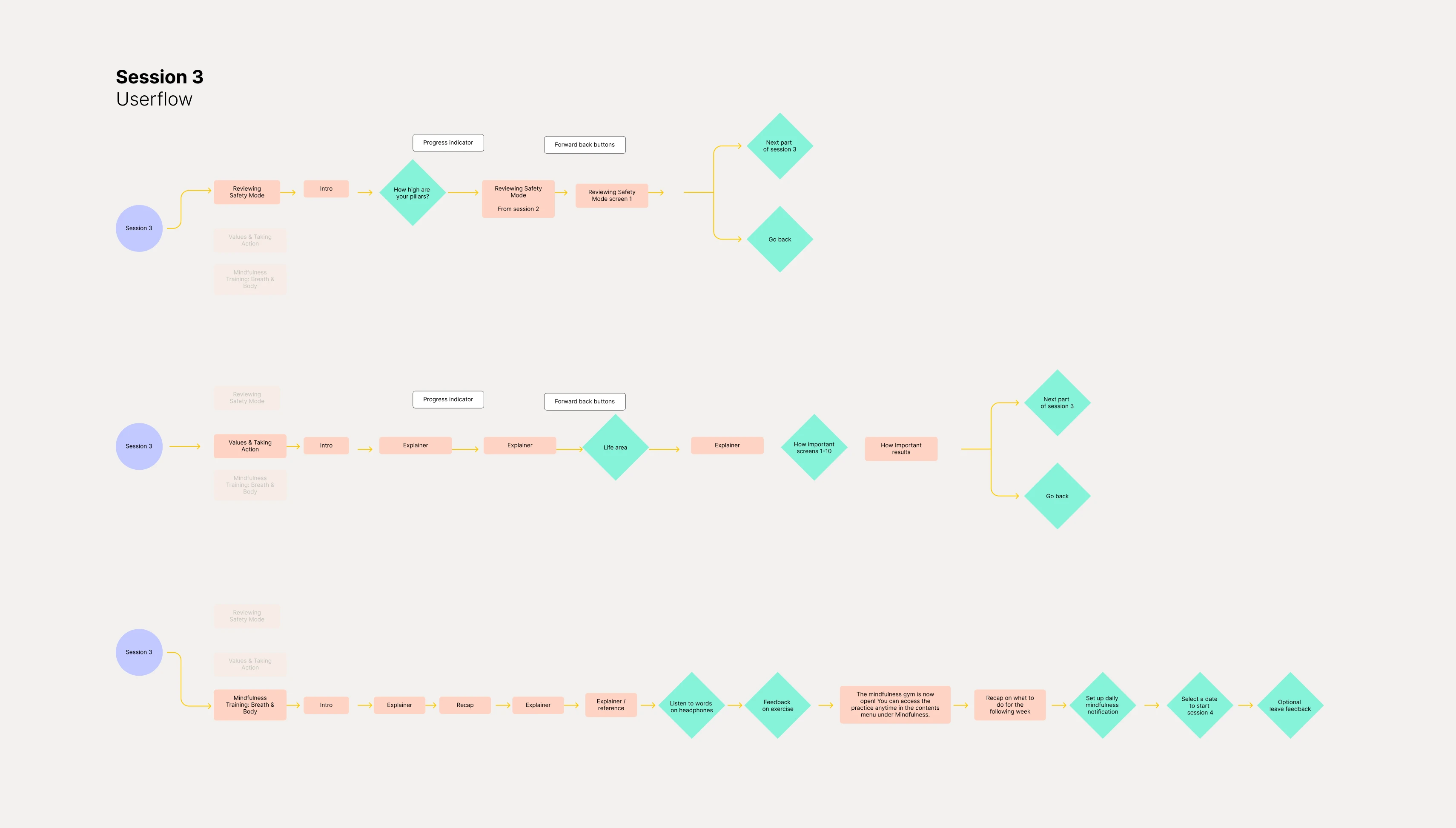 User and client interviews gave real insight into the user needs and allowed me to create a solid hierarchy of information. Upon arriving on the home screen a user would see all key information. Onboarding on how to use the app, 1x session (plus expanded) view and the header for Skill builders. Secondary to this users could access personal notes and also get extra help should they need the support.