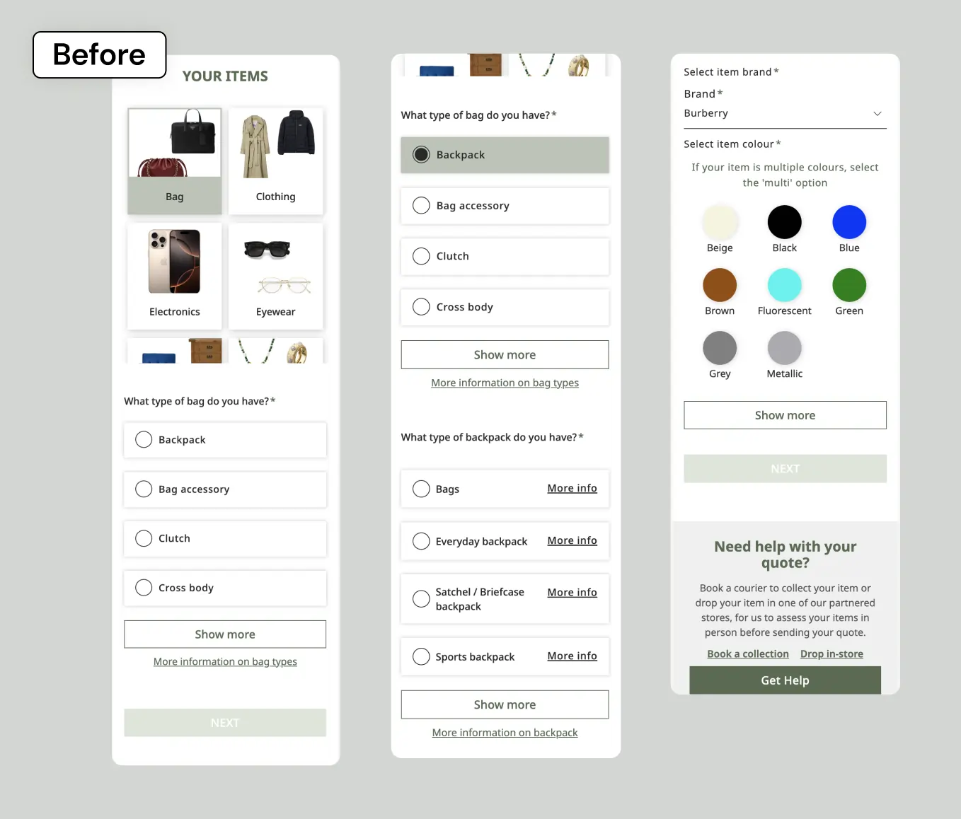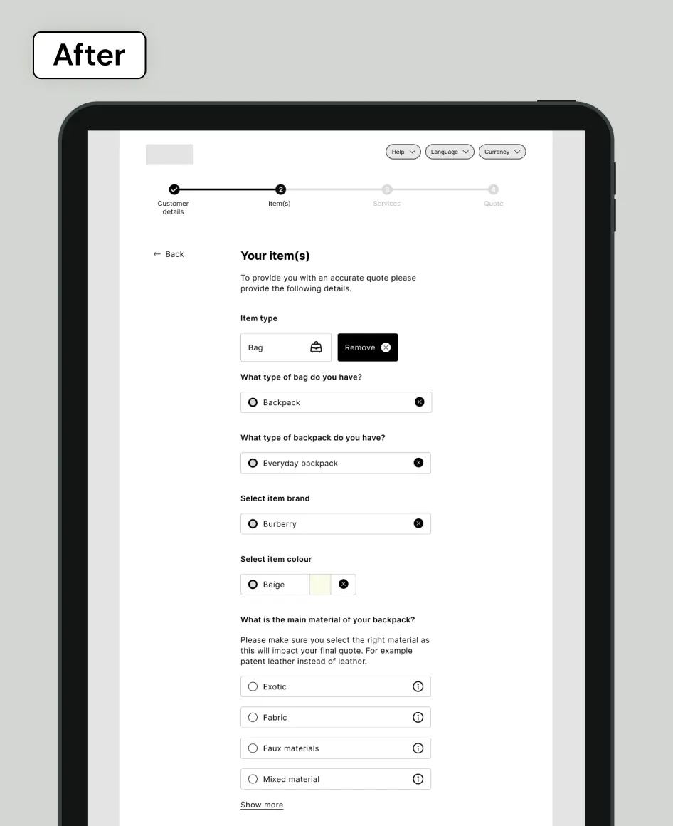 The journey for users filling in a repair online or staff logging an in-store repair was quite a cumbersome experience. Online users wanted this journey to be quick, seamless, to feel self-assured and trusted in the process, ideally with an upfront cost at the end. Store staff also had a similar need while also potentially juggling a queue of customers in-store.