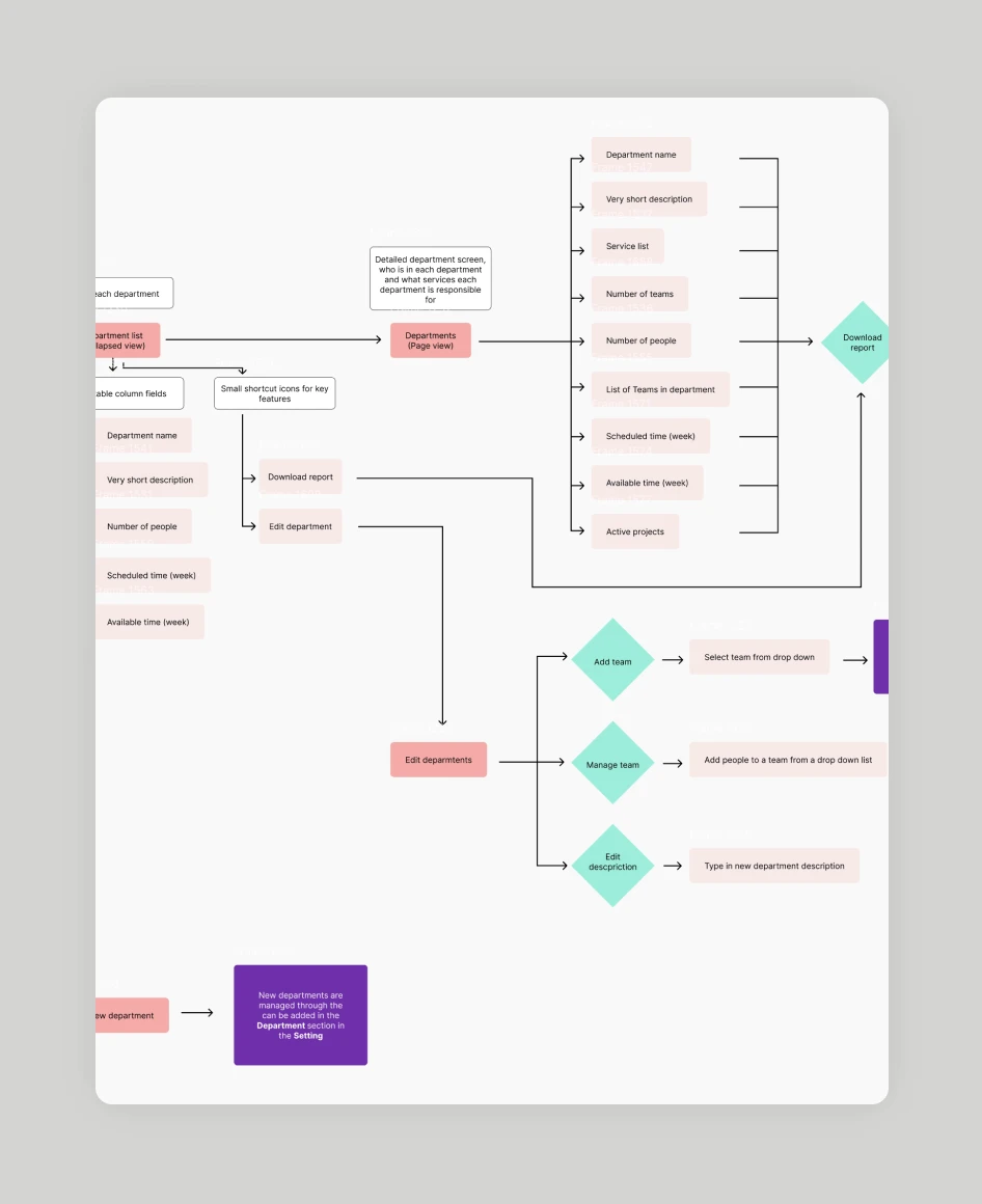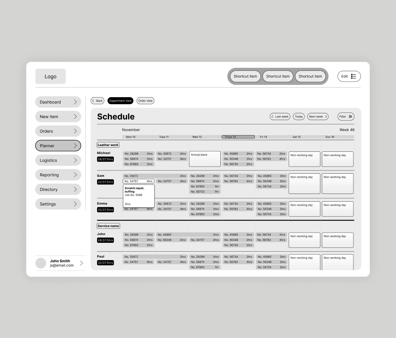 We would bring over all scheduling, job queues, department details and team members to the one area of the new architecture. Like Float.com we would introduce a schedule screen where users could allocate, manage and track workload coming in and out of the shop.