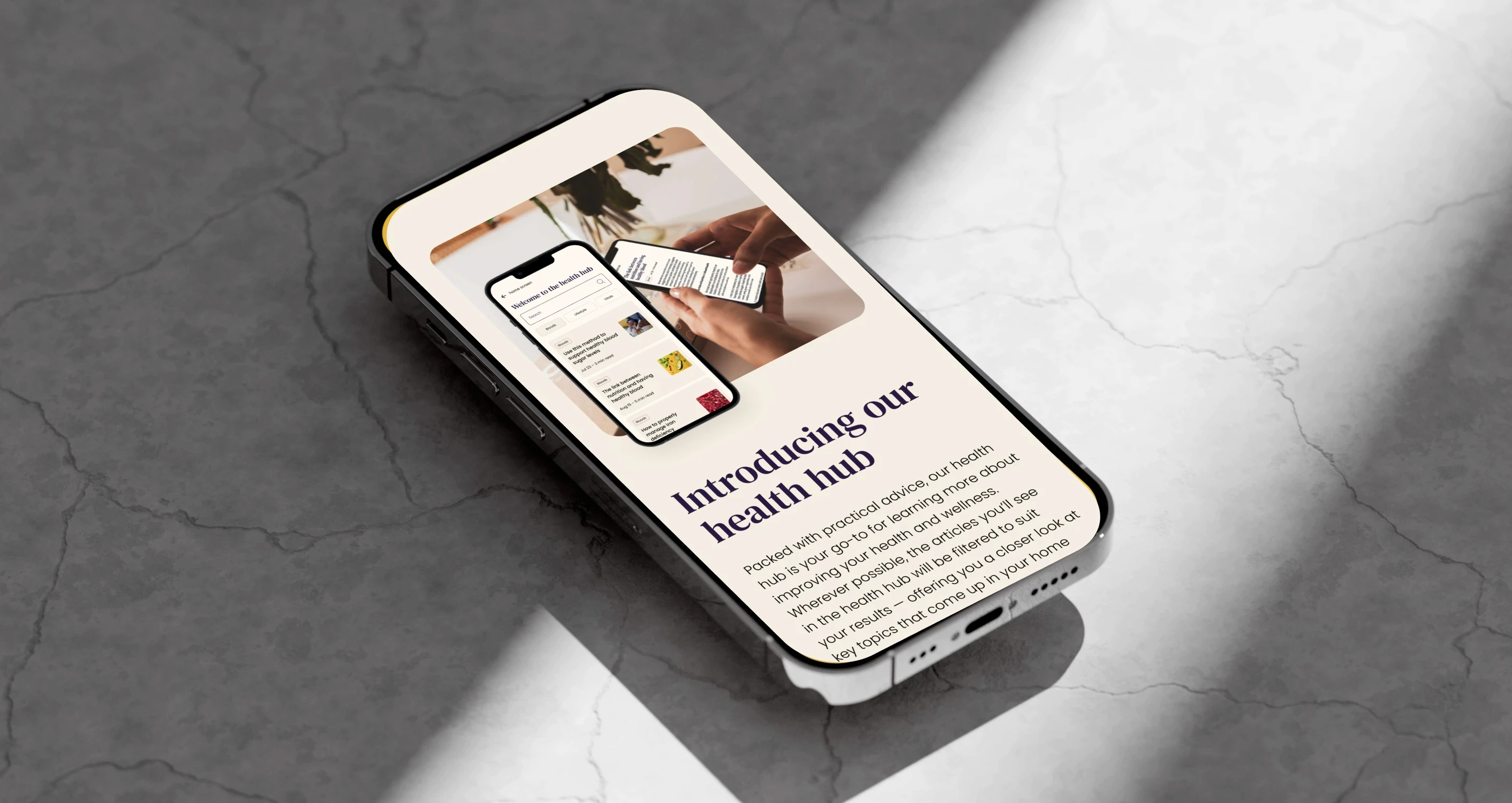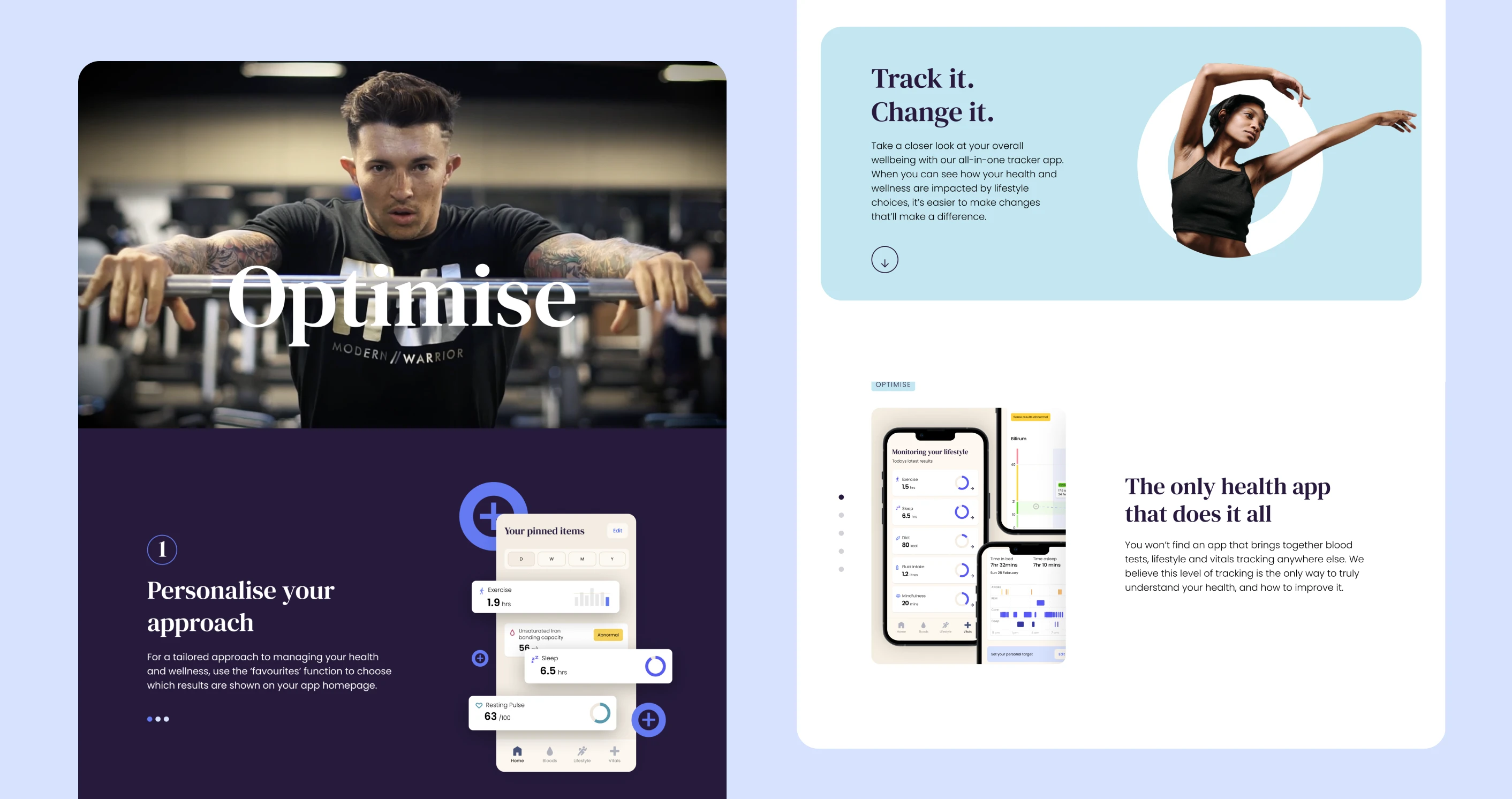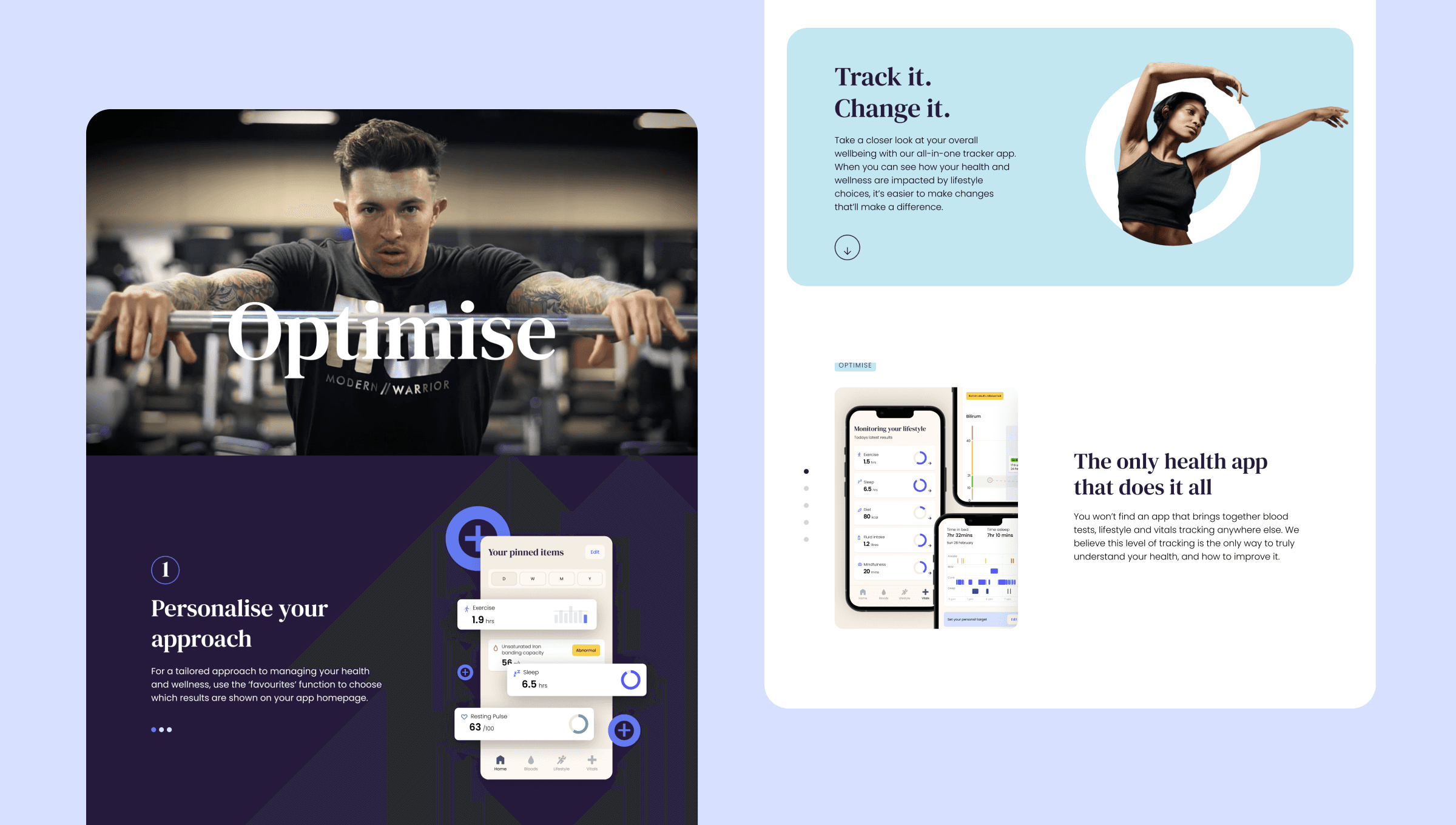 Alongside the creation of the app I also designed the marketing site. Some of the key challenges in marketing the app was that we didn't have the app finished, far from it, the client was still undecided as to the offering, the revenue would be created primarily from selling blood tests but they didn't want marketed as a blood test provider, it had to be a more rounded holistic approach. We also wanted the marketing site live months in advance of the app release date to give the marketing team a central place where all channels could point too.